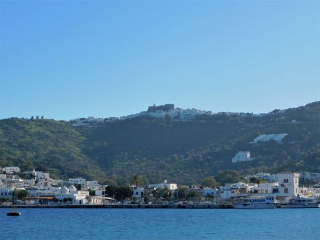 Previous Image Next Image A vista from across the bay Skala, the port of Patmos, with Chora, the old town, on the top of the hill. The heavily fortified monastery of Christodoulos looms over Patmos and has defied invasion for nigh a thousand years.